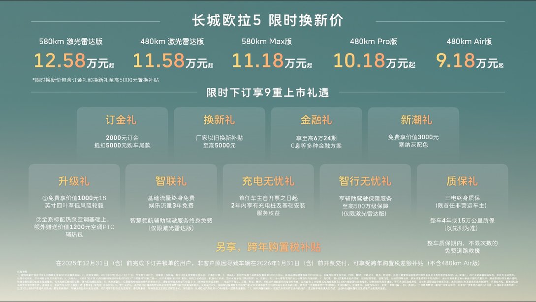 长城汽车欧拉品牌全新A级纯电SUV——长城欧拉5正式上市。新车共推出5款配置,建议零售价区间为 9.98万至13.38万元,限时换新价9.18万元起(限时换新价包含“订金礼”和“换新礼”至高5000元以旧换新补贴)。为回馈广大用户的热爱与支持,即日起至2025年12月31日,用户下订并锁单即可尊享包含订金礼、换新礼、智行无忧礼在内的9重上市好礼,以及跨年购置税补贴(不含480km Air版)等丰厚购车权益。凭借诚意十足的价格权益与越级产品力,长城欧拉5致力于成为全球年轻用户的“严选搭子”。