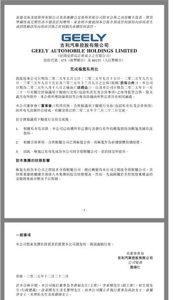 吉利汽车与极氪整合完成12月22日,吉利汽车控股有限公司(0175.HK)(简称“吉利汽车”)发布公告,宣布已正式完成极氪智能科技控股有限公司(简称“极氪”)私有化及合并事项的交易,极氪已成为吉利汽车的全资附属公司,并从即日起于纽交所退市。展望未来,吉利汽车将以此次整合完成为全新起点,充分发挥战略协同与规模效应,持续加大在智能化、电动化核心领域的投入,为全体股东创造可持续的长期价值,向科技引领型全球汽车企业全面进化。