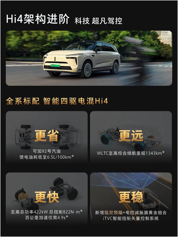 Hi4性能版,是全球首创的四挡全速域直驱技术。在路上的表现可概括为:跑得省、跑得远、跑得快、跑得稳。在4.9秒零百加速性能的同时,还能达成6.5L/100km的超低馈电油耗,更能带来1343km综合续航。并通过前后50:50轴荷分配与iTVC智能扭矩控制,为全家出行提供了从容安稳的驾乘体验。真正实现了“四驱的性能,两驱的花费”。