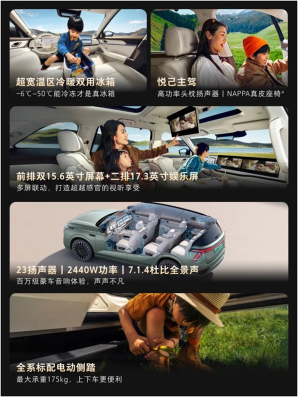 在空间布局上,蓝山智能进阶版坚持舒适平权,从主驾的八点按摩、副驾的一键零重力模式,到二排带腿托的“头等舱”座椅与一键拓展的奢侈空间,再到确保成人可坐可躺的实用第三排,每个座位都承载着对家人的尊重与关怀。配合-6℃-50℃的7L豪华⼤冰箱,将实用关怀融入每一处设计,让豪华成为全家共享的日常体验。