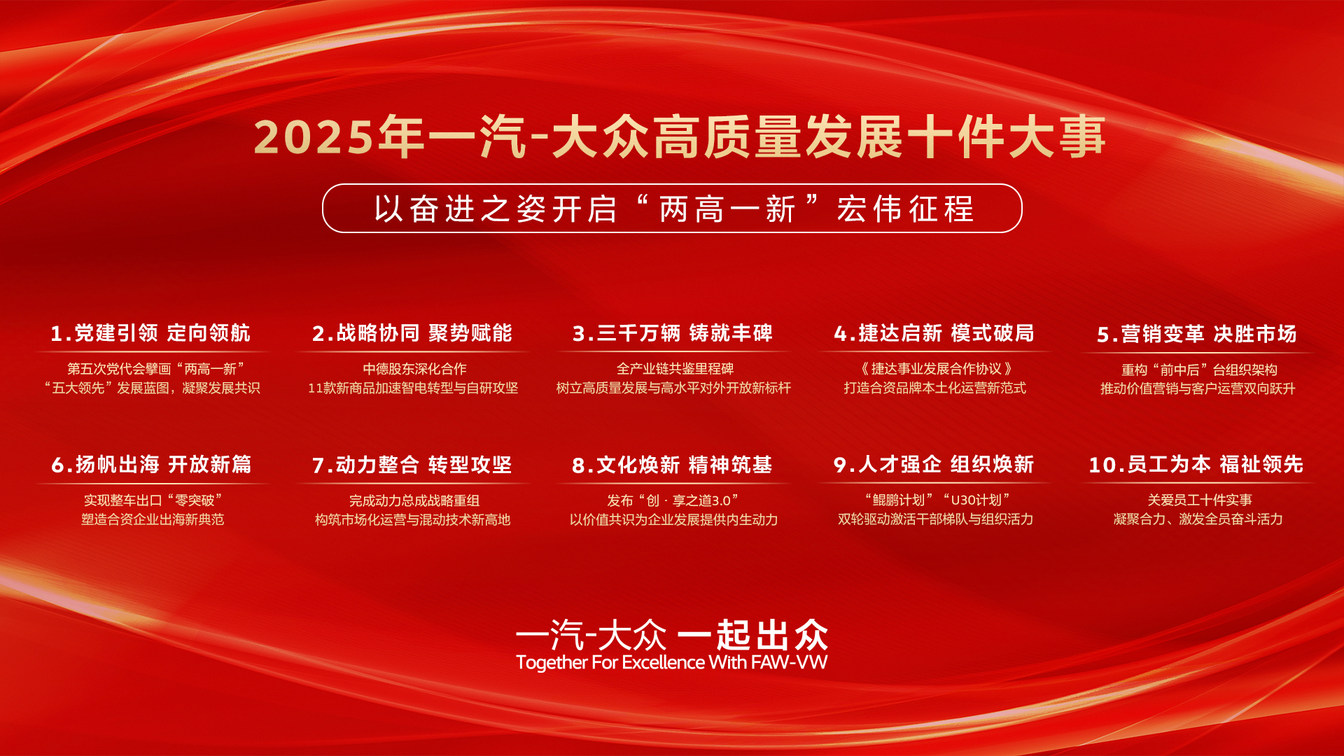 2025 年,作为深耕中国市场 34 年的行业中坚,一汽 - 大众以产业报国为初心,以稳健经营为基石,通过十项关键举措完成了从规模引领到质量跃迁的重要跨越,在 “十四五” 与 “十五五” 的历史交汇点上,为合资品牌的高质量发展树立了新典范。