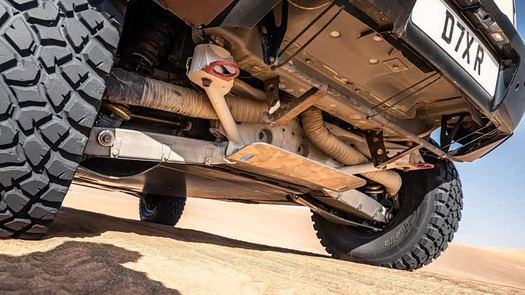 达喀尔拉力赛的残酷之处,在于它对车辆的考验是全方位的:既要应对沙丘跳跃的剧烈冲击,又要承受岩石路段的持续剐蹭,还要在数百公里的长赛段中保持稳定性能,悬挂系统与 Bilstein 深度合作,轴配备平行双减震器,既保留了与量产版相同的悬挂安装点以符合规则,又通过特殊调校提升了减震器的抗疲劳性能。这套系统能轻松应对沙丘着陆时的巨大冲击力,同时在连续颠簸路段保持车身稳定。配合 35 英寸全地形轮胎与加宽 60 毫米的轮距,车辆的接地面积与侧向稳定性大幅提升,即使在松软沙地中也能保持精准的转向响应,同时这样的设计,又能适配 550 升超大油箱的重量变化。35 英寸全地形轮胎与加宽轮距提升了接地面积,前后保险杠微调优化了通过角,让沙丘穿行更从容。