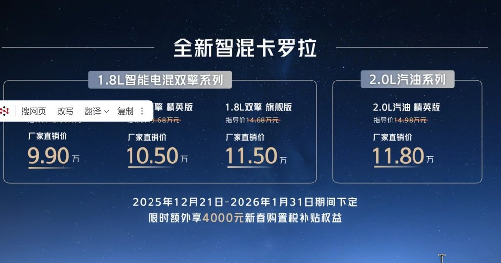 9.9万元 全新智混卡罗拉焕新上市