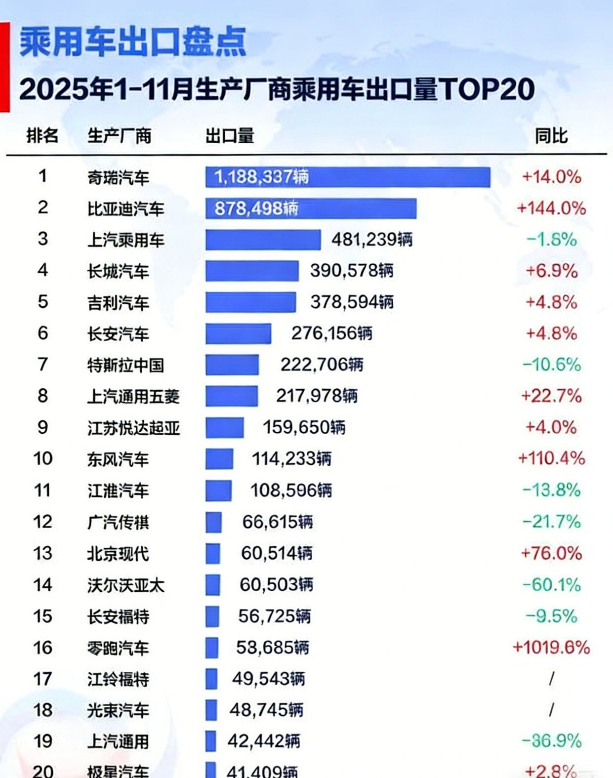 根据可靠数据显示,2025年11月,比亚迪乘用车出口量达到12.8万台,同比增长313.4%;今年1-11月累计出口87.8万台,同比增长144%。凭借多元化产品矩阵,比亚迪精准契合了全球不同市场消费者的差异化需求,多国销冠全面超越。