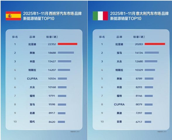 2025年1-11月,比亚迪在英国、德国、意大利、西班牙、奥地利、爱尔兰、马来西亚、土耳其、新加坡、泰国、中国等11个汽车核心国家市场,销量已经全面超越特斯拉。凭借多元化产品矩阵,比亚迪精准契合了全球不同市场消费者的差异化需求。同时,通过推进自建滚装船、本地化生产、构建完善的服务体系等一系列协同举措,为其海外拓展提供了坚实支撑。在这些出海策略的有力推动下,比亚迪出海狂飙全球领跑。
