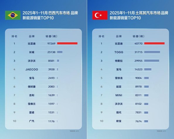 11月,比亚迪在巴西、土耳其、意大利、西班牙、匈牙利、克罗地亚等国拿下了新能源汽车销量第一,在新加坡等国家获得全品牌销冠。1-11月累计表现同样不俗,在巴西、土耳其、西班牙、意大利等国,比亚迪位列新能源汽车品牌销量榜首;在新加坡、中国香港等地区市场荣膺全品牌销量第一,备受消费者认可。