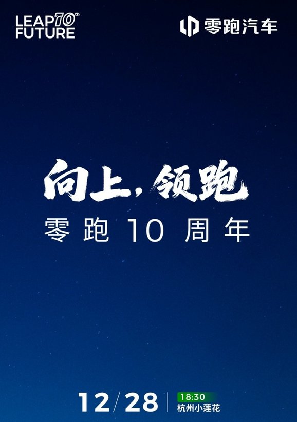 12月28日,零跑汽车将在杭州奥体中心体育馆(小莲花),举办以“向上,领跑”为主题的十周年发布会,邀请员工、用户、伙伴、投资方等各界代表,共同见证十年答卷的揭晓。