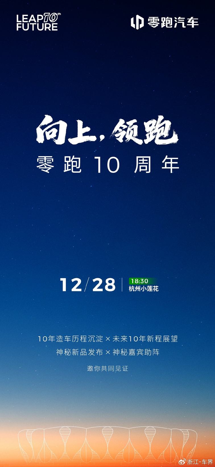 同时,零跑汽车宣布将于12月28日在杭州奥体中心体育馆(小莲花)举办以“向上,领跑”为主题的十周年发布会。在成立十周年这一重要节点,零跑汽车盛情邀请十年来砥砺同行的员工代表、用户代表、伙伴代表、投资方代表等,共同见证这一凝聚过往、开启未来的历史性时刻。