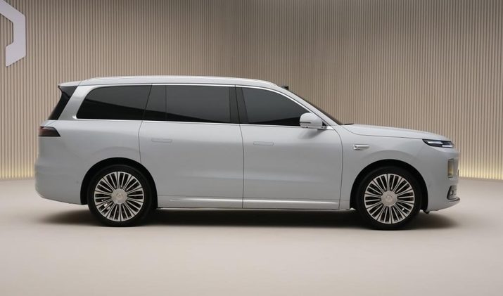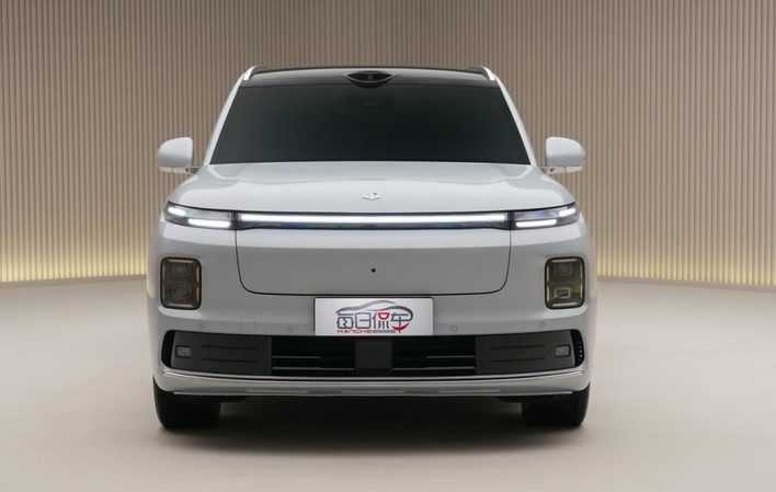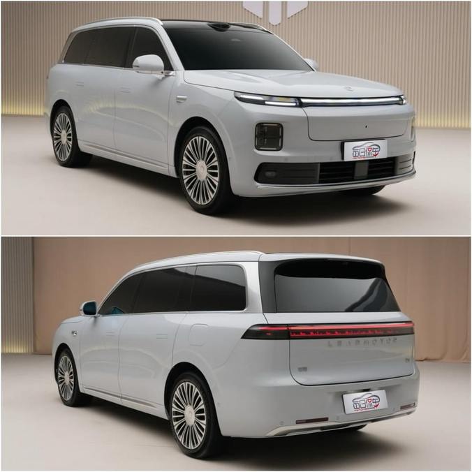 侧面造型与理想L9相似,尺寸方面目测也差不多,轴距应该超过3米1,车长超过5米2,宽度在2米左右,高度1米8左右。跟理想L9差别较大的地方就是D柱变得更细且更加垂直,车尾的倾斜度没有理想L9那么大,显然是为了拓展座舱空间的做法,而且可以增大第三排侧窗的面积。车顶集成一颗激光雷达,前翼子板集成了侧后摄像头,新车将采用LEAP 4.0中央域控架构,采用舱驾一体化芯片,将搭载双高通骁龙8797芯片,算力达1280TOPS,能够实现VLA辅助驾驶和端侧大模型智能座舱。