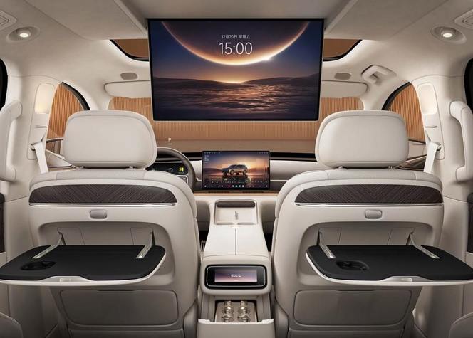 中排提供两个小桌板,车载冰箱的容积达到8.1L,还有6英寸的后排控制屏。车顶则布置了21.4英寸吸顶屏,保证中后排乘客的娱乐需求得到满足。另外,车内还提供智能香氛系统。