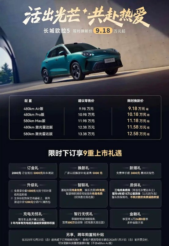 在 9.18万元起的限时换新价和涵盖金融、充电、质保等多方面的上市礼遇加持下,长城欧拉5的入手门槛和价值感已被拉满。对于务实派,入门版车型已能提供出色的设计、质感与主流功能,是一台高性价比的精品纯电SUV。