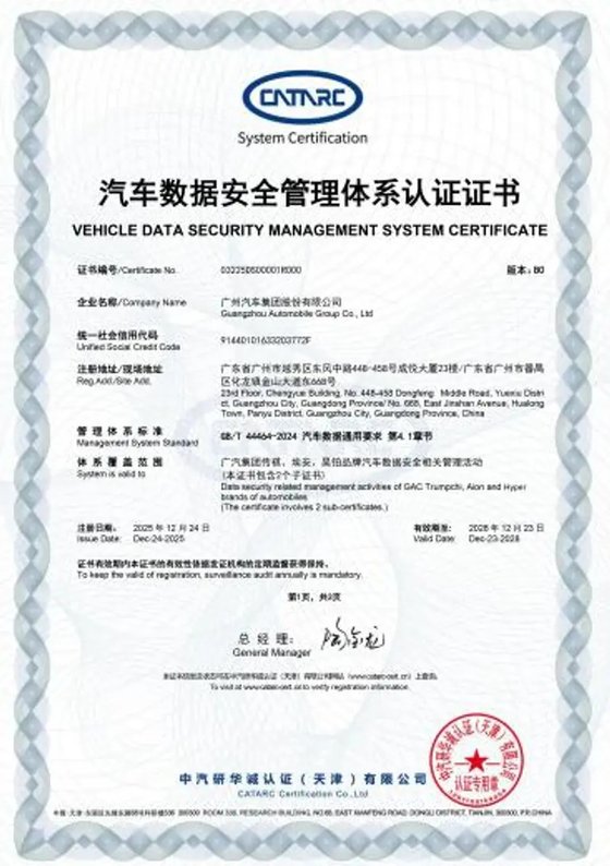 值得一提的是,广汽集团旗下昊铂HL ( 参数 | 询价 | 图片 ) 、传祺向往S7近期已成功通过国家级数据安全合规检测,在车外人脸信息等匿名化处理、座舱数据车内处理、默认不收集座舱数据、处理个人信息显著告知、精度范围适用5项合规要求中表现突出,以扎实的技术实践印证了管理体系的有效性。