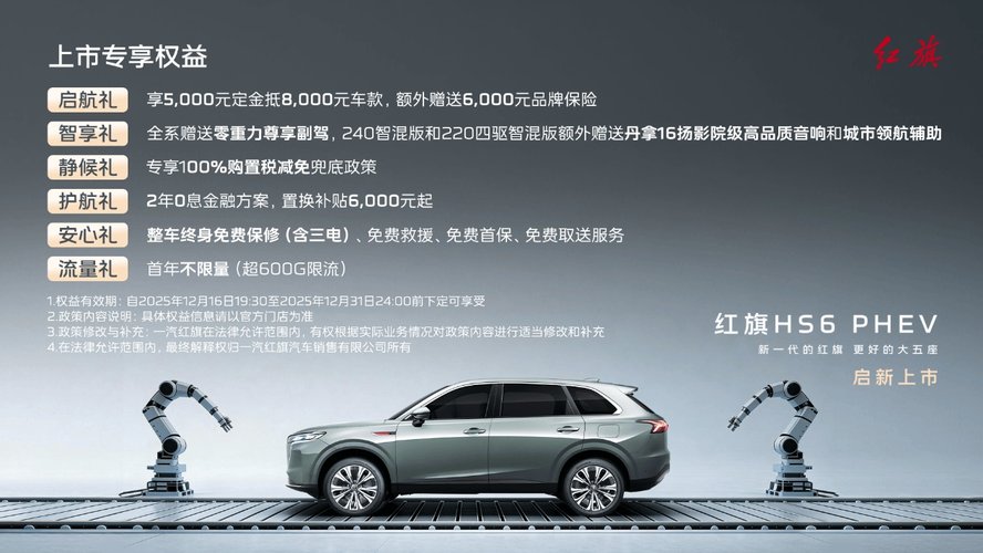 2025年12月16日,全新一代大五座旗舰SUV红旗HS6 PHEV正式上市,发布会主题为“诚挚相见,共鉴新一代”,以全景直播形式举办,是红旗向“为家造车”转型的关键车型,新车以丰富的装备和踏实务实的国车品质,直面用户真实需求,提升中大型插混SUV价值获得感。