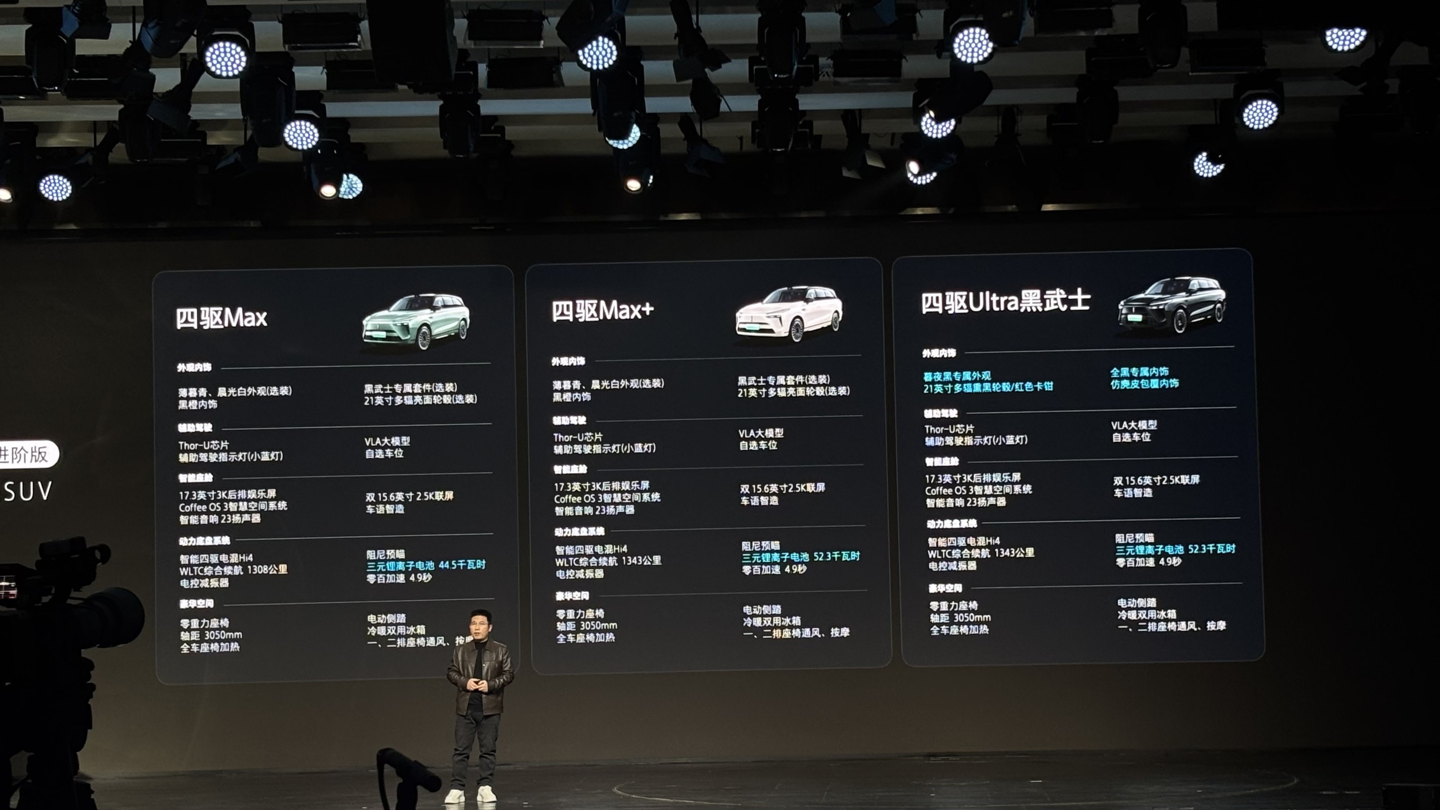 如此对比便清晰许多:入门版本在功能性配置方面已经没有短板,44.5kWh的也足以满足日常使用。值得一提的是,中低配两个版本都支持选装黑武士套件、仿麂皮内饰,并享有3000元的选装基金。所以综合看下来,四驱Max版的可购买度更高。
