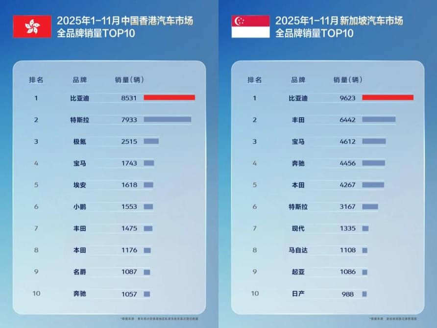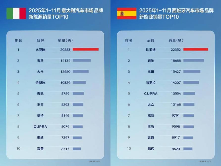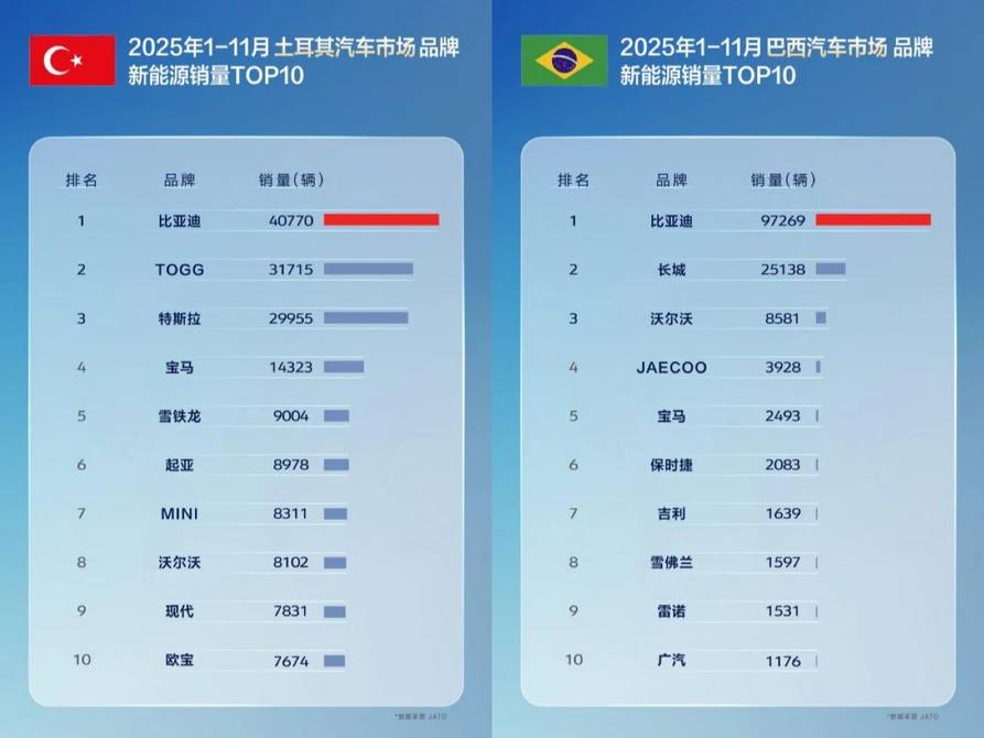 11月,比亚迪在巴西、土耳其、意大利、西班牙、匈牙利、克罗地亚等国拿下了新能源汽车销量第一,在新加坡等国家获得全品牌销冠。1-11月累计表现同样不俗,在巴西、土耳其、西班牙、意大利等国,比亚迪位列新能源汽车品牌销量榜首,获得多个国家消费者认可;在新加坡、中国香港等地区市场荣膺全品牌销量第一。