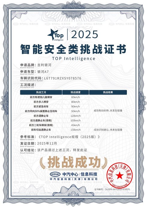 12月25日,吉利银河A7成功通过中汽中心行业首次中型插混轿车「双TOP」顶级安全挑战,成为行业唯一同时获颁安全性能类挑战证书和智能安全类挑战证书的的车型。安全家轿认准银河A7!凭借吉利汽车全域安全体系的最坚实底座,吉利银河成为了全球最快达成年销百万辆的新能源汽车品牌,作为银河品牌主打车型之一,吉利银河A7完整继承了吉利的安全基因,凭借7大核心安全实力,成功通过中汽中心安全大考,再次证明其作为十万级混动家轿安全新标杆的颠覆性实力。