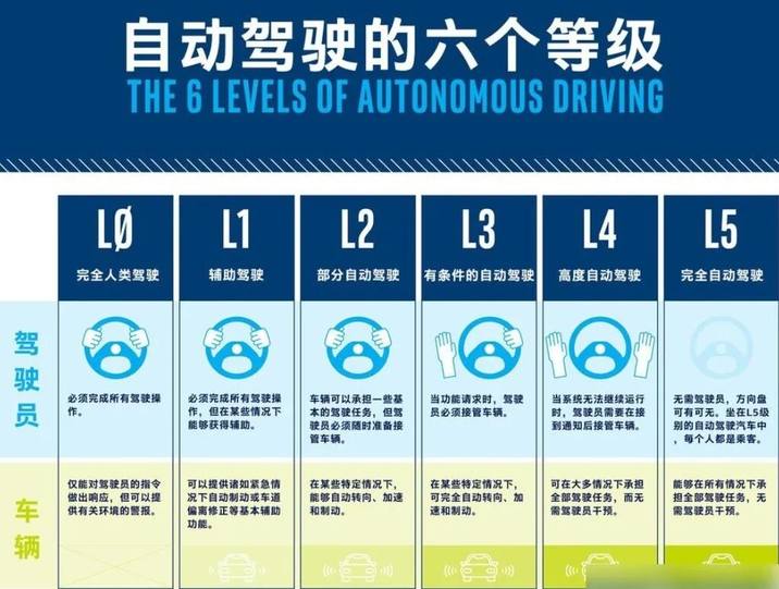 根据SAE(国际自动机工程师协会)以及国内相关标准规定,智能驾驶一共分为6个等级,从L0到L5。
