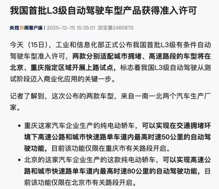 岁末寒冬,工信部一纸公告,瞬间点燃了汽车行业的热情。12月15日,工业和信息化部正式公布,我国首批L3级自动驾驶车型准入许可。
