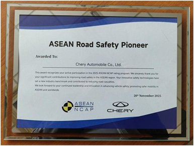 图为ASEAN NCAP官方授予奇瑞汽车“东盟道路安全先锋奖”