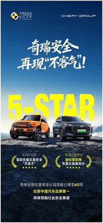 截至目前,奇瑞全球五星安全认证车型总数已增至60项,本年度已新增20项,两项数据均位居中国汽车品牌第一,持续领跑行业安全赛道。