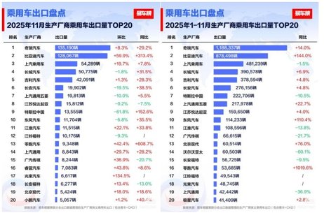 据易车数据显示,2025年11月,比亚迪乘用车出口量达到12.8万台,同比增长313.4%;今年1-11月累计出口87.8万台,同比增长144%,较2024全年总出口量已实现翻倍式增长,比亚迪成为中国出口增速最快的车企之一。