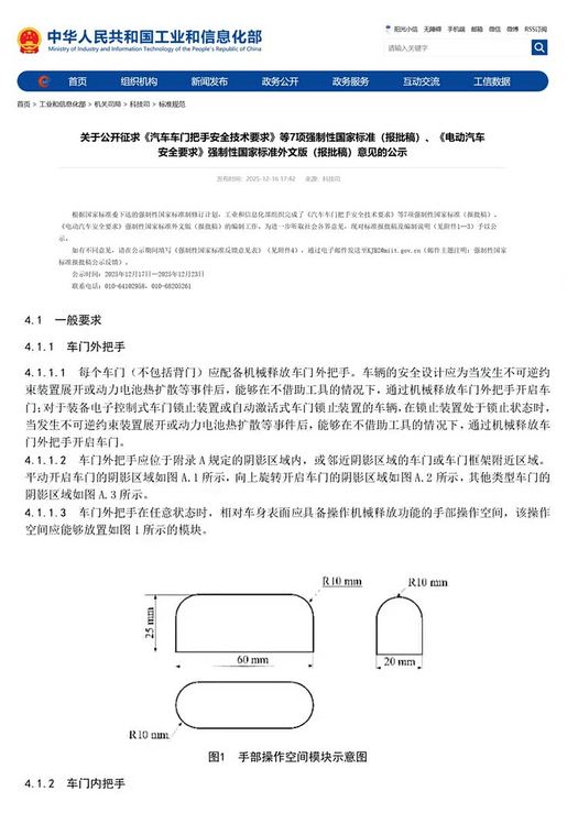 为解决上述隐患,工信部《汽车车门把手安全技术要求》(2027 年实施)围绕 “机械冗余” 和 “可及性” 制定严格标准,彻底终结全隐藏式把手的设计潮流: