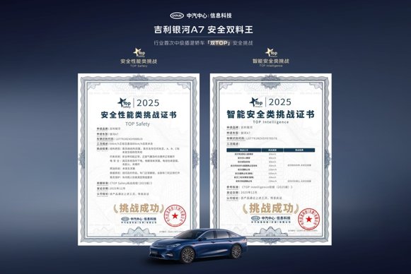 12月25日,吉利银河A7成功通过中汽中心行业首次中型插混轿车「双TOP」顶级安全挑战,成为行业唯一同时获颁安全性能类挑战证书和智能安全类挑战证书的的车型。安全家轿认准银河A7!凭借吉利汽车全域安全体系的最坚实底座,吉利银河成为了全球最快达成年销百万辆的新能源汽车品牌,作为银河品牌主打车型之一,吉利银河A7完整继承了吉利的安全基因,凭借7大核心安全实力,成功通过中汽中心安全大考,再次证明其作为十万级混动家轿安全新标杆的颠覆性实力。