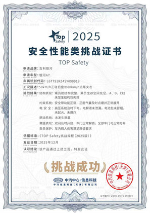 12月25日,吉利银河A7成功通过中汽中心行业首次中型插混轿车“双 TOP”顶级安全挑战,成为行业唯一同时获颁安全性能类挑战证书和智能安全类挑战证书的的车型。安全家轿认准银河A7!凭借吉利汽车全域安全体系的最坚实底座,吉利银河成为了全球最快达成年销百万辆的新能源汽车品牌,作为银河品牌主打车型之一,吉利银河A7完整继承了吉利的安全基因,凭借7大核心安全实力,成功通过中汽中心安全大考,再次证明其作为十万级混动家轿安全新标杆的颠覆性实力。