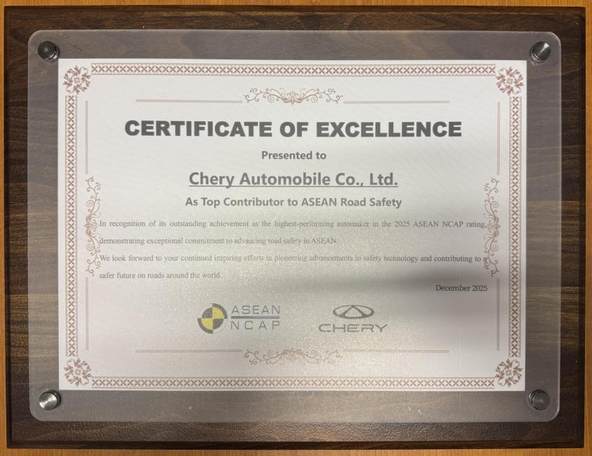图为ASEAN NCAP官方授予奇瑞汽车“东盟道路安全先锋奖”