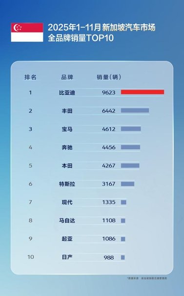11月,比亚迪在巴西、土耳其、意大利、西班牙、匈牙利、克罗地亚等国拿下了新能源汽车销量第一,在新加坡等国家获得全品牌销冠。1-11月累计表现同样不俗,在巴西、土耳其、西班牙、意大利等国,比亚迪位列新能源汽车品牌销量榜首,获得多个国家消费者认可;在新加坡、中国香港等地区市场荣膺全品牌销量第一。