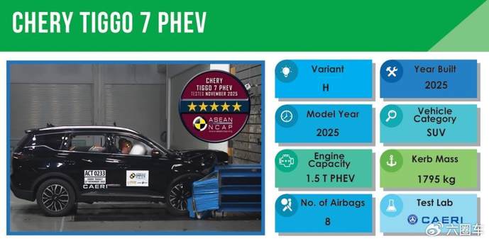 “安全奇瑞”在全球顶级安全评测中再获突破:在东盟新车安全评鉴(ASEAN NCAP)评级中,瑞虎7 PHEV不仅拿下五星安全,更以94.68的综合得分,打破了该机构自2011年成立以来的最高分纪录;iCAR V23(海外名称iCAUR V23)成为获得ASEAN NCAP认证的首款“五星方盒子”车型。