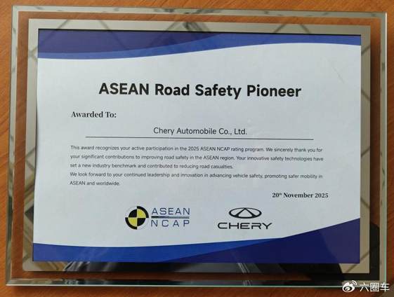 图为ASEAN NCAP官方授予奇瑞汽车“东盟道路安全先锋奖”
