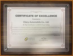 图为ASEAN NCAP官方授予奇瑞汽车“东盟道路安全先锋奖”