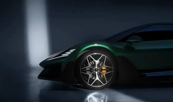 从图中可以看出,新车定位超级跑车,当然是一款纯电车。它的车身结构非常修长,前后翼子板还采用了隆起的设计,给人的感觉非常有力量感。轮圈则是六辐式花瓣轮圈,以及中央螺栓缩结构,预计将会配备碳陶制动系统。另外新车的侧面还有两个看点,一个是大尺寸的侧翼端板设计,另一个则是隐藏式A柱设计。