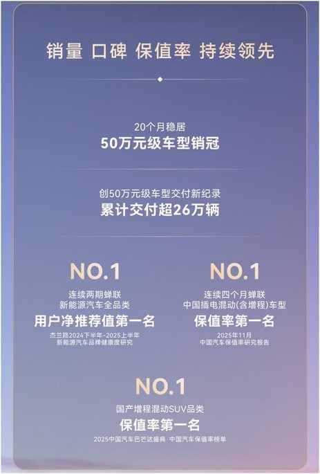 问界M9的成功,不止于销量。在中国汽车流通协会发布的《2025年11月中国汽车保值率研究报告》中,问界M9已连续四个月蝉联中国插电混动(含增程)车型保值率第一,并在2025中国汽车巴芒达盛典“中国汽车保值率榜单”中位列国产增程混动SUV第一,展现50万级豪华车价值新高度。