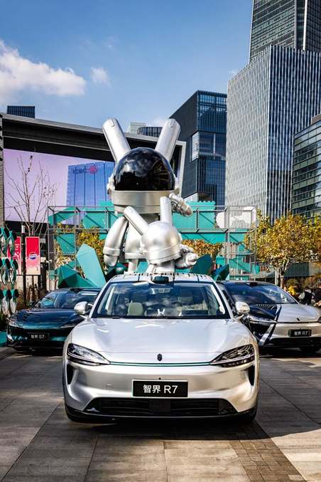 活动现场,10台覆盖先锋潮流涂装的智界R7与S7(含ROBBi联名款)组成强大视觉矩阵,与首次亮相的巨型ROBBi潮玩装置交相辉映,瞬间成为焦点。这些展车生动诠释了智界“美在每一面”的设计哲学。