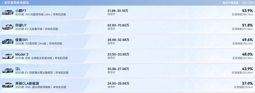 尽管小鹏P7的表现可圈可点,但我们必须清醒地看到:即便达成率第一,冬季实际续航折半依然是残酷的现实。对于东北黑龙江等地的家庭用户而言,这意味着: