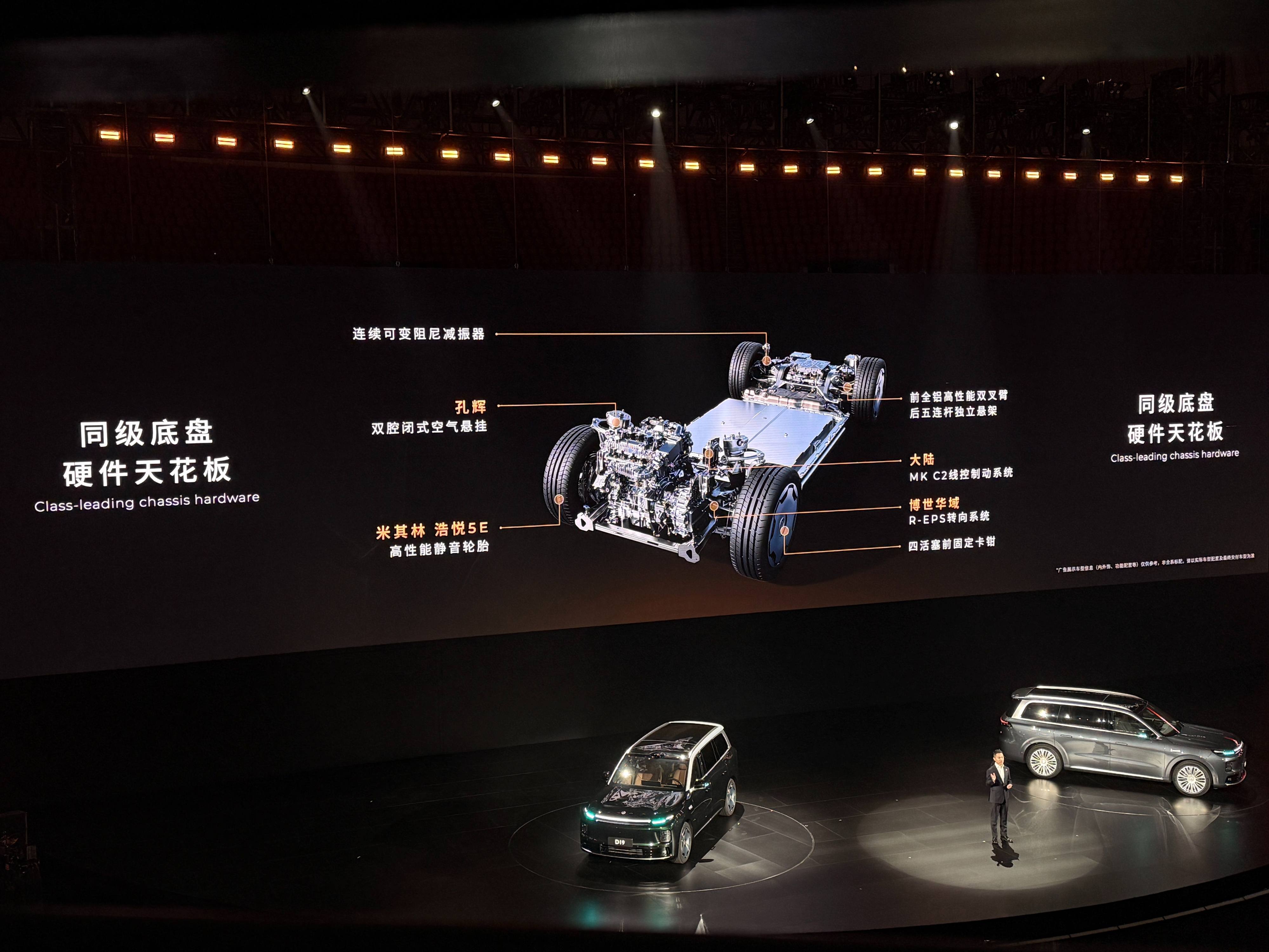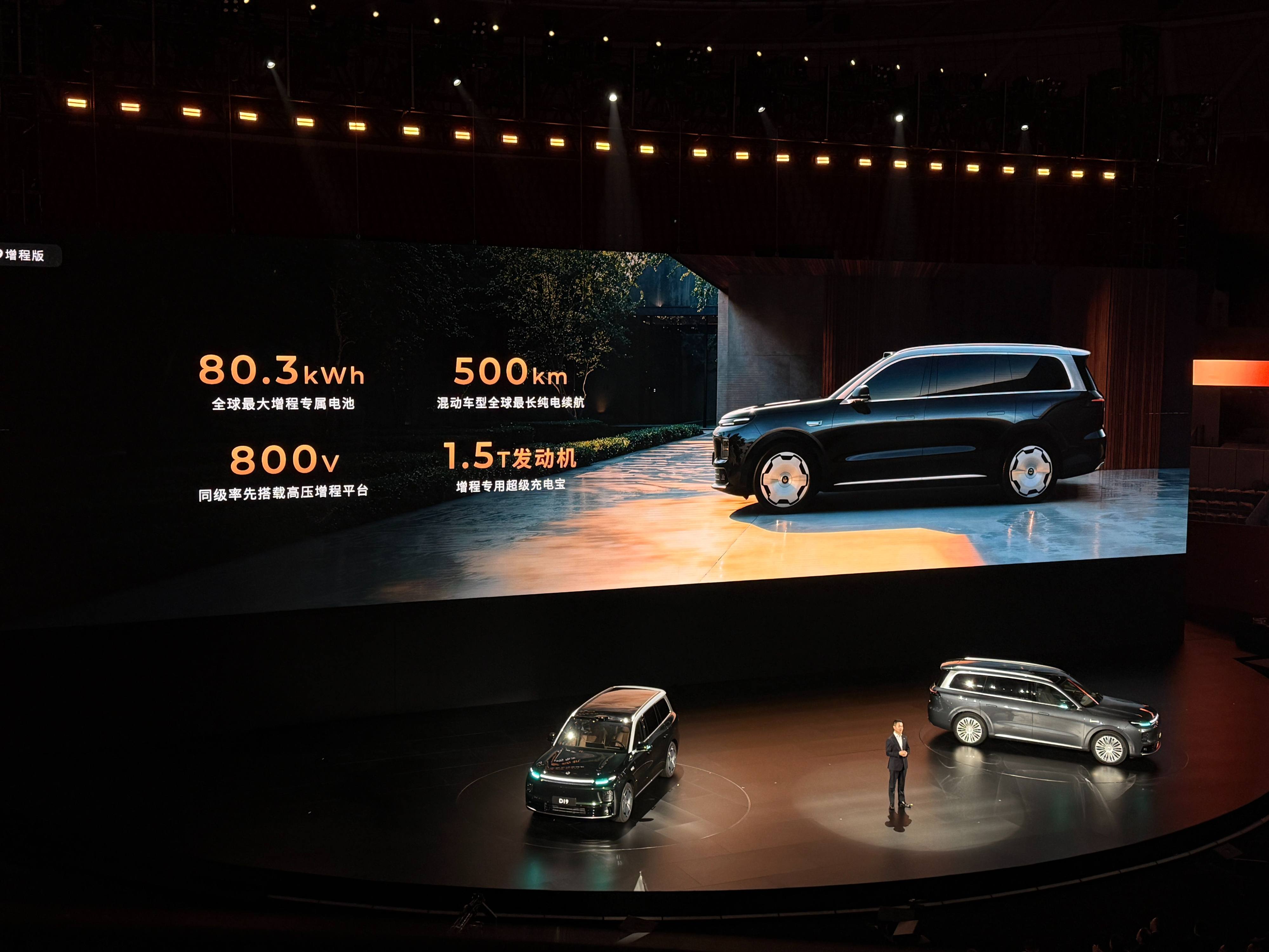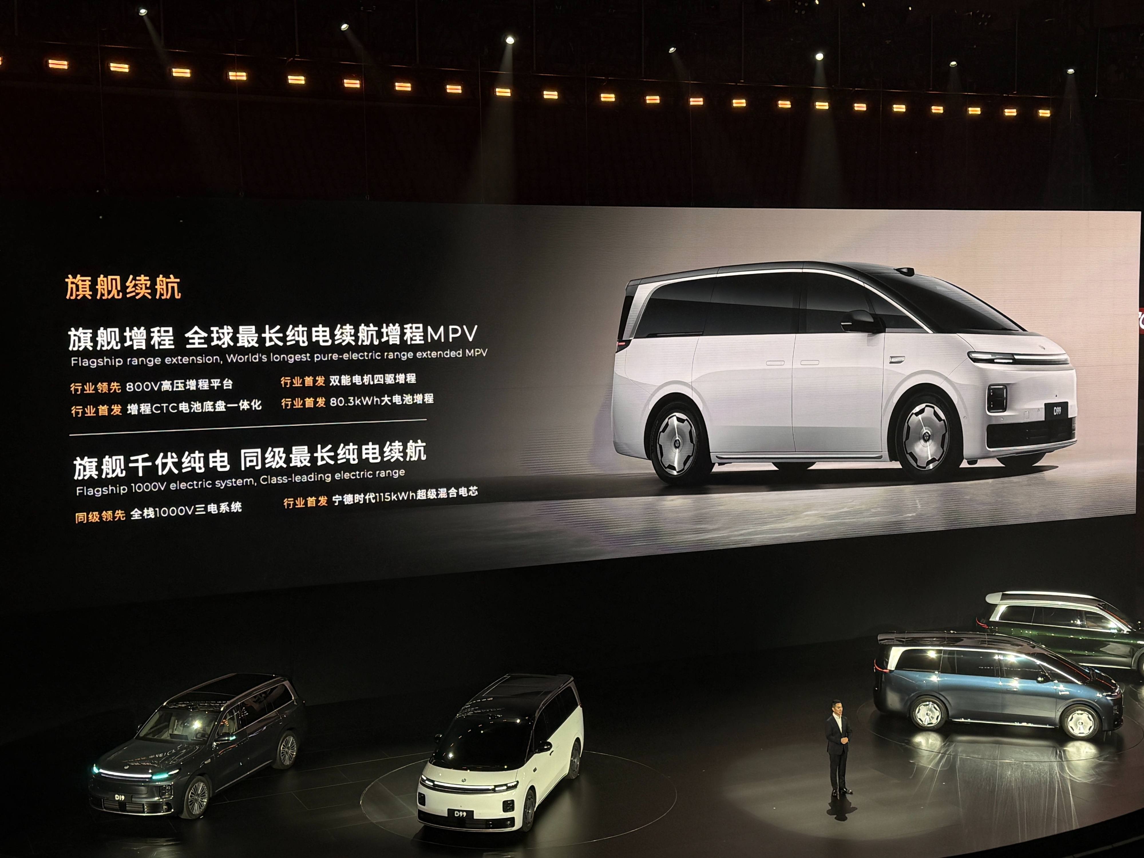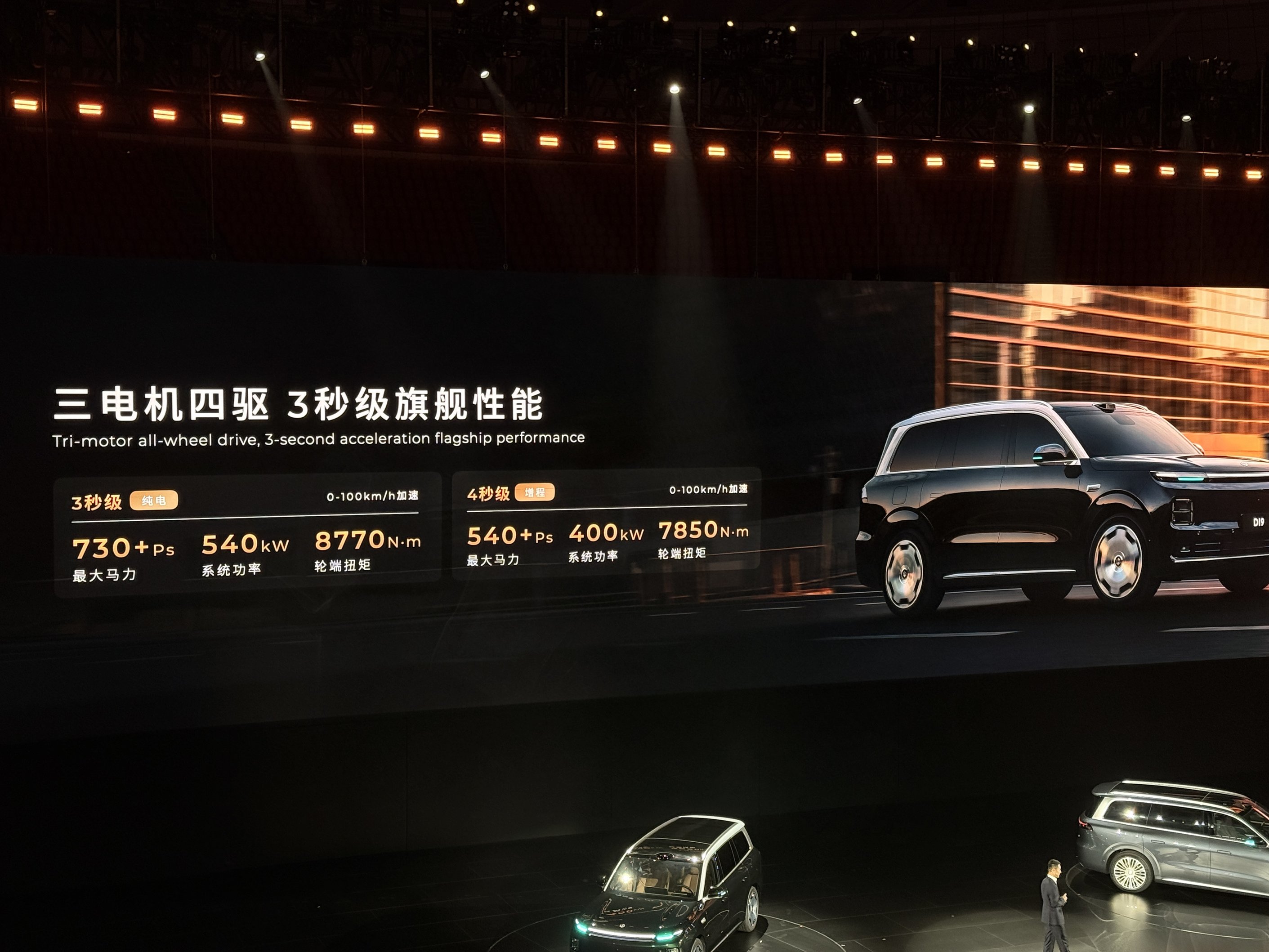 纯电版车型使用的电池包容量为115kWh,CLTC纯电续航达到了720km,配合全域千伏高压架构,峰值快充功率超过460kW,充电15分钟补能超350km。纯电版车型采用了前后三电机四驱系统,综合功率达到了540kW,官方0-100km/h加速时间达到了3秒级。