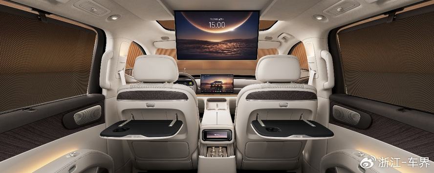 座椅配置堪称“移动头等舱”,采用百万级豪车同源的半苯胺头层真皮材质,高定V形绗缝、大师级辊边与奢侈品手包为灵感的珍珠打孔工艺,兼顾视觉美感与体感舒适。座椅拥有12层奢享级结构设计,配备加热、电动调节功能,前两排更搭载吸风式通风与10点式SPA级气动按摩。二排120°真零重力座椅支持坐垫15°抬升与4向超大行程腿托,搭配ABTS一体式安全带,带来全身承托的悬浮休憩体验。第三排支持131°无级电动调节并首搭双扶手,配合EZE便捷进出系统,让每一排都能享受平等的豪华待遇。