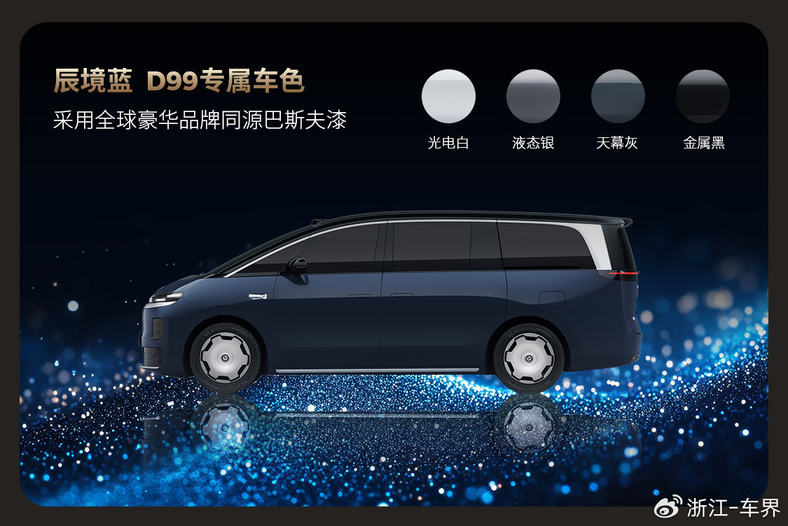 在色彩设计上,零跑D99坚持“自然共生”理念,雕琢出五款意境悠远的豪华外观色,赋予车辆独特的视觉灵魂。其中,“辰境蓝”为零跑D99的专属色,静止时呈现沉稳克制的绅士气质,驰骋在阳光下则会唤醒细腻珠光,折射出年轻灵动的气息。为呈现这种高级质感,零跑选用顶级豪华品牌同款的巴斯夫车漆,让颜色更通透、层次更丰富,且光泽持久不易失色。此外,光电白的纯粹冷峻、液态银的温暖优雅、天幕灰的深邃莫测与金属黑的低调不凡,五款自然灵感色分别对应不同的审美志趣,让每一台零跑D99都能成为用户个性与气质的延伸。