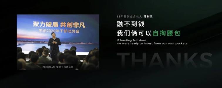 同时我也非常感谢傅总在15年支持我再次创业,创建零跑。特别是在2020年,新能源汽车行业迎来了低潮,融资极其困难,傅总在零跑骨干员工大会上给大家鼓劲,承诺在没有外部投资人投资的情况下,他和我两个人按比例出资,至少养活大家三年,极大的鼓舞了大家的斗志。