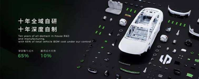 经过十年的沉淀,我们自研自制的核心零部件的比例已经占到整车BOM成本的65%,如果按供应商平均15%毛利率计算,与外购相比,零跑整车成本有10%的优势,随着零跑销量规模的不断扩大,这个优势就越来越明显,这个也是零跑未来持续竞争力的护城河。很多人都说零跑不仅仅是一个整车公司,更是一个规模超大的零部件公司。