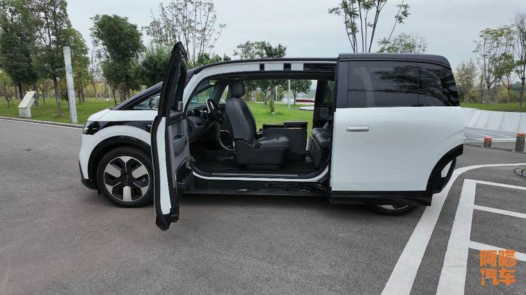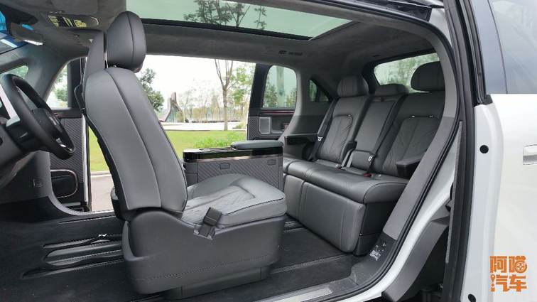 将车门全部打开后,能够发现这辆车没有传统的B柱,采用无B柱设计,整个车厢看起来比较通透。