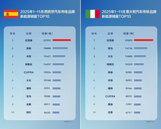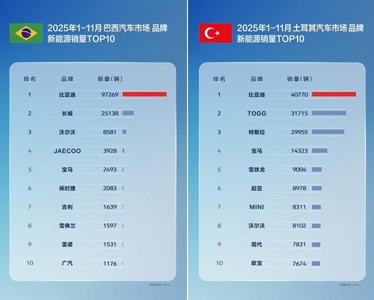 11月,比亚迪在巴西、土耳其、意大利、西班牙、匈牙利、克罗地亚等国拿下了新能源汽车销量第一,在新加坡等国家获得全品牌销冠。1-11月累计表现同样不俗,在巴西、土耳其、西班牙、意大利等国,比亚迪位列新能源汽车品牌销量榜首,获得多个国家消费者认可;在新加坡、中国香港等地区市场荣膺全品牌销量第一。