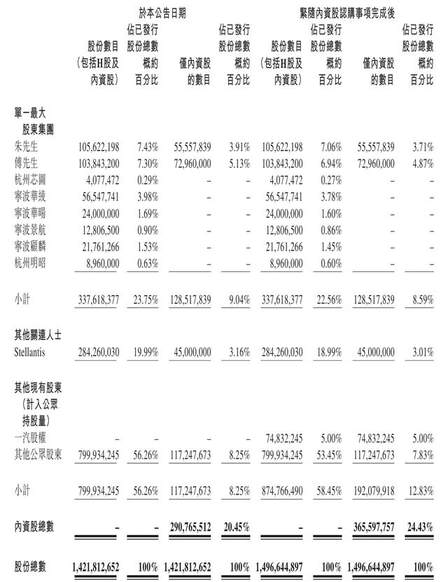 此次交易前,零跑汽车创始人、董事长、CEO朱江明持股为7.43%,傅利泉持股为7.3%,宁波华绫持股为3.98%,宁波华暘持股为1.69%,宁波景航持股为0.9%,宁波顾麟持股为1.53%,杭州明昭持股为0.63%,杭州芯图持股为0.29%,外资股东Stellantis持股为19.99%;