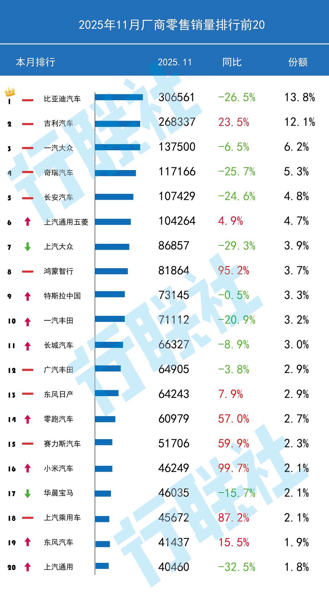 据乘联分会最新统计,11月比亚迪零售306561辆,厂商排名仍居第一,但同比增长-26.5%,连续5个月同比下降。在零售厂商排名前20中,11月大多数厂商呈现同比负增长。但是鸿蒙智行、小米汽车、零跑汽车等都逆势大涨,同比增长率都超过了50%。