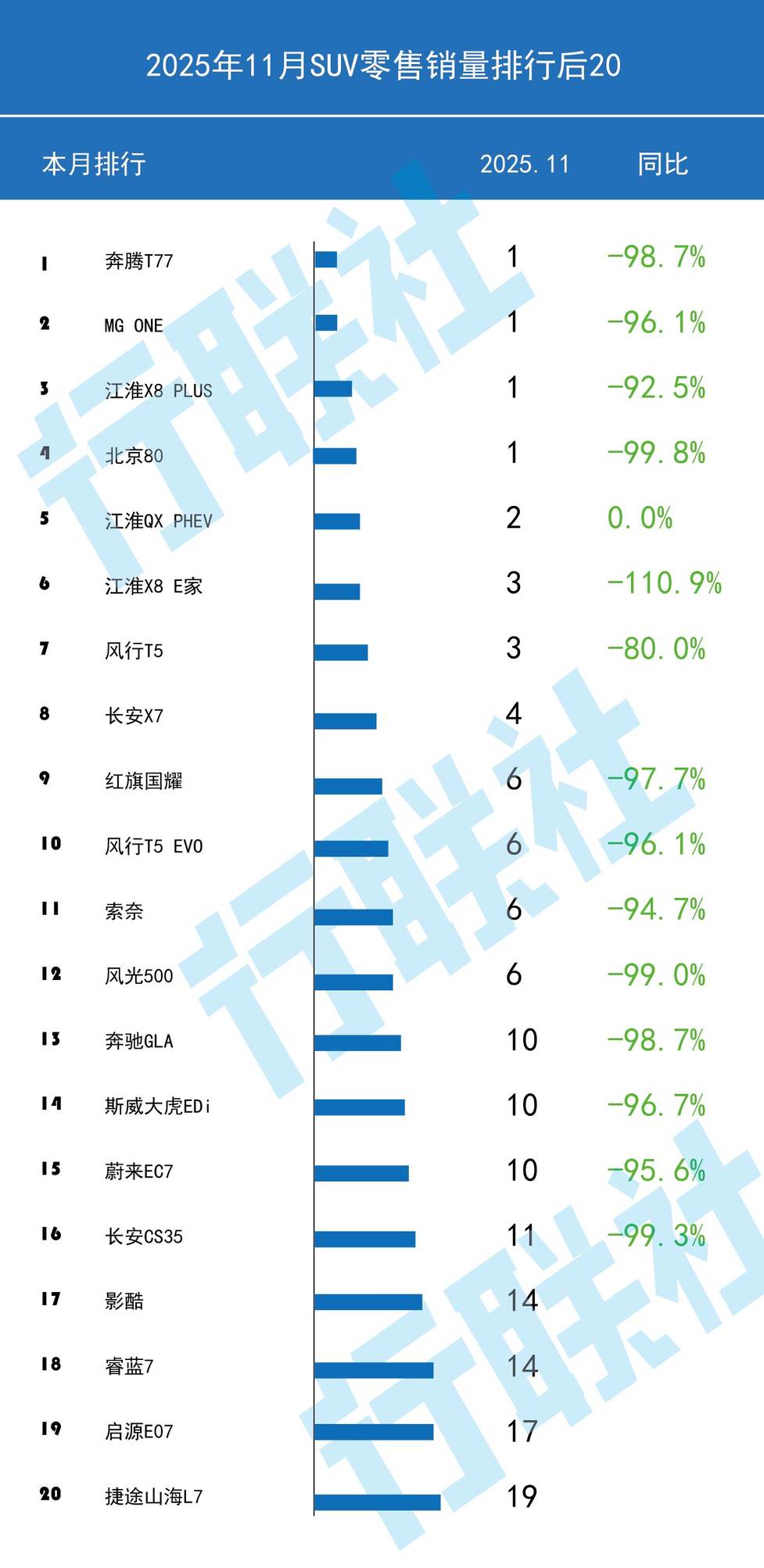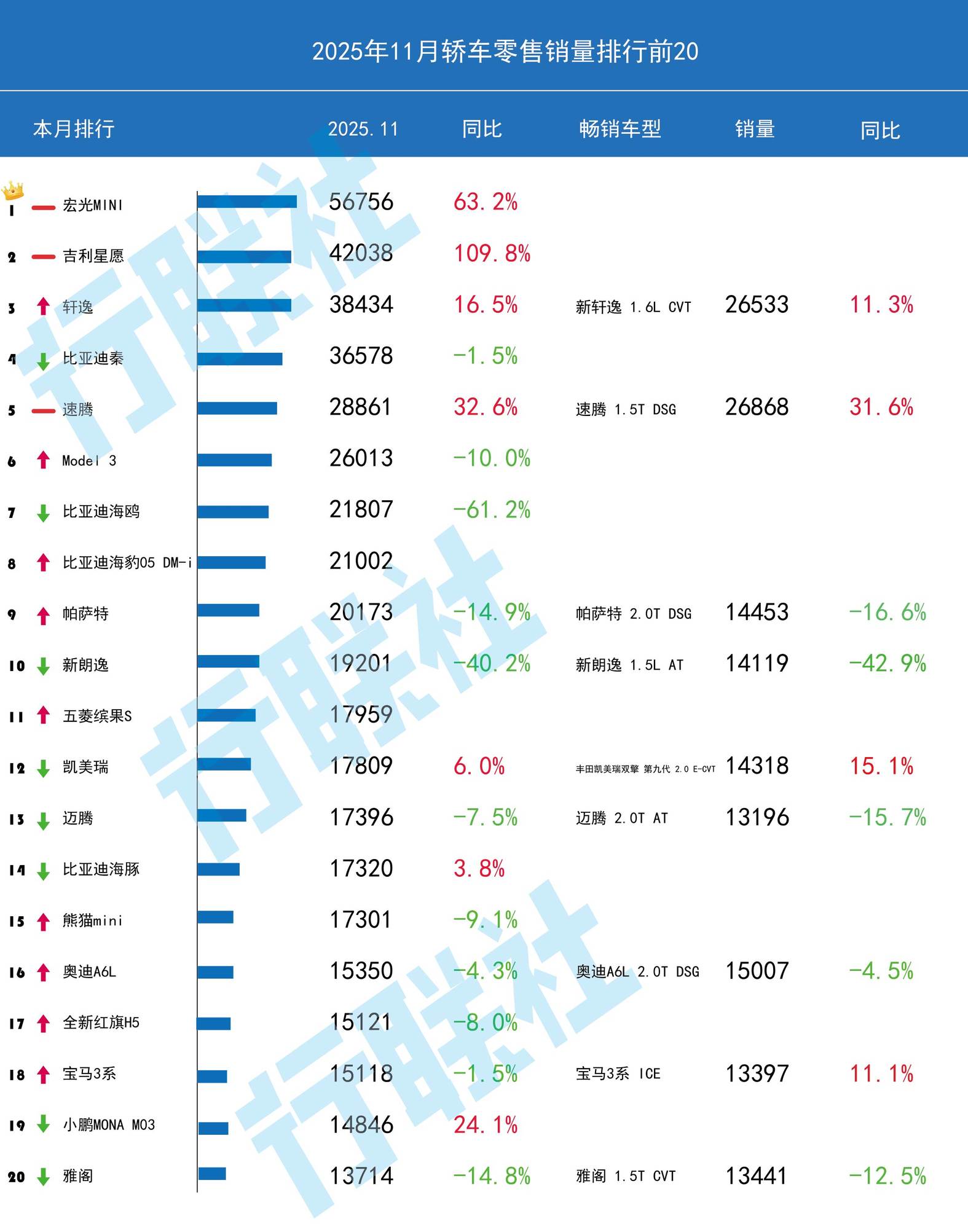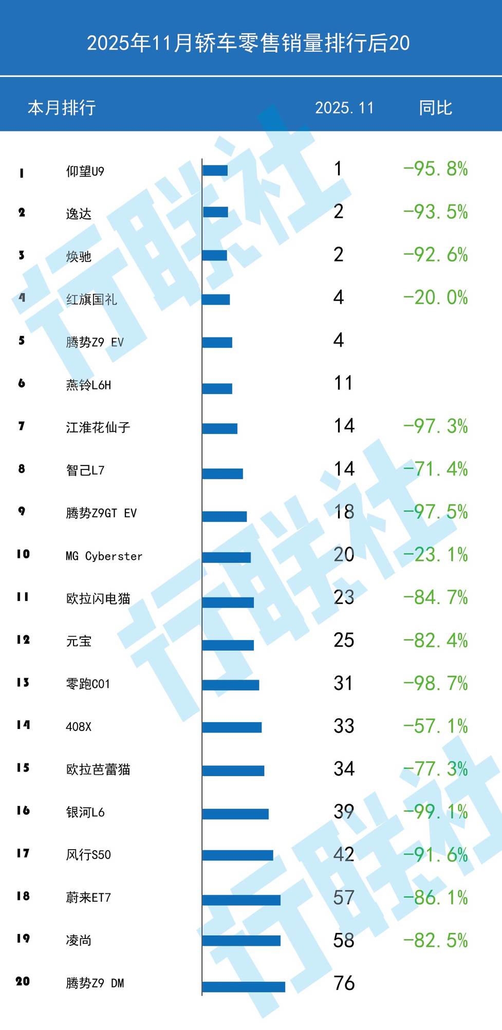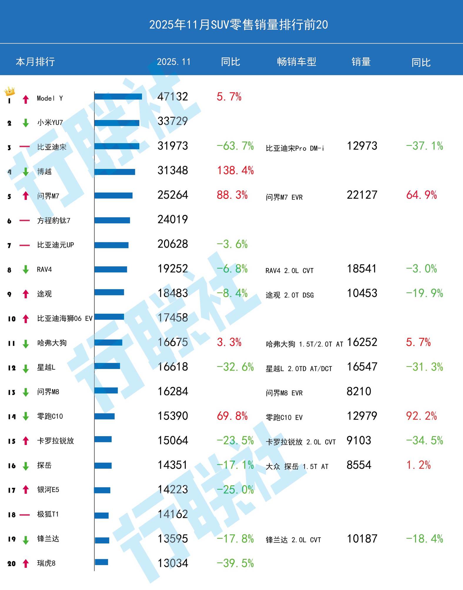 有分析人士认为,比亚迪零售近几个月同比大幅下降与自主品牌、合资品牌降价 + 智能化 / 插混升级,在主流与高端市场形成挤压有关,比亚迪 “以价换量” 虽保份额但压缩利润,部分主力车型周期性承压。从车型来看,11月零售排行前20中,比亚迪海鸥销量21807辆,同比增长-61.2%;比亚迪宋销量31973辆,同比增长-63.7%,这些畅销车型销量下降,也是比亚迪11月销量同比负增长的主要原因。