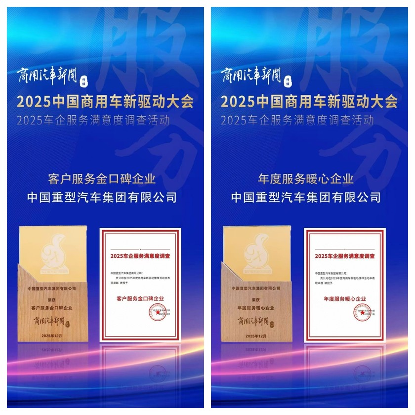 在商用车行业从产品驱动迈向价值驱动的关键期,企业服务的深度与温度,正成为衡量品牌高度的核心标尺。近日,中国重汽在2025年度商用车新驱动榜样活动中连续斩获“客户 服务金口碑企业”和“年度服务暖心企业”两项殊荣。这是行业对其卓越服务体系的权威认证,更是万千卡友的口碑加持与信赖托付。中国重汽不仅为客户创造了可量化、可感知的理性价值,更将其升华为有质感、有回响的温度。
