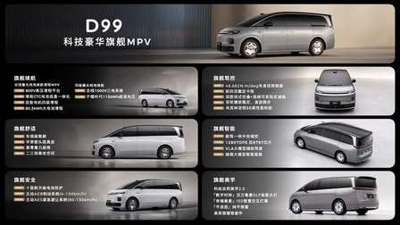 D99同样提供增程与纯电双动力。增程版搭载80.3kWh电池与800V高压平台;纯电版配备115kWh电池与全栈1000V系统。车内全球MPV首发车规级氧舱,搭配半苯胺真皮与零重力座椅,营造头等舱般的舒适体验。智能与驾控方面,它共享D19的双8797芯片、舱驾一体域控、VLA智驾等顶级配置,并拥有同级领先的车身扭转刚度、双腔空悬及一系列主动安全技术,确保全能旗舰实力。