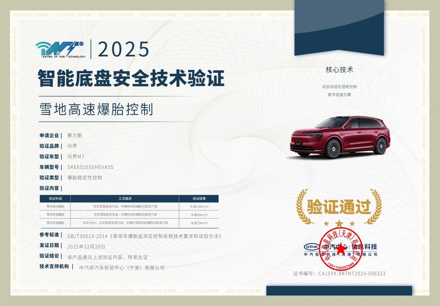 有车网特约报道:12月30日,中汽中心正式公布2025冬季测试结果,全新问界M7在极端低温环境下表现卓越,荣获“综合性能类验证”及“智能底盘安全技术验证”两大权威证书。显方权威机构,此次冬季,彰显出车辆在极寒环境下的整车可靠品质与安全实力。